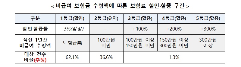 가입자는 보험료 갱신 전 1년 동안의 비급여 보험금 수령액에 따라 5개의 구간으로 나뉩니다. 비급여 보험금을 전혀 수령하지 않은 경우 보험료 할인이 적용되고, 100만 원 이상 수령한 경우 최대 300%까지 할증됩니다. 금융 당국은 대부분의 가입자가 보험료 할인 혜택을 받거나 유지될 것으로 예상하고 있습니다.